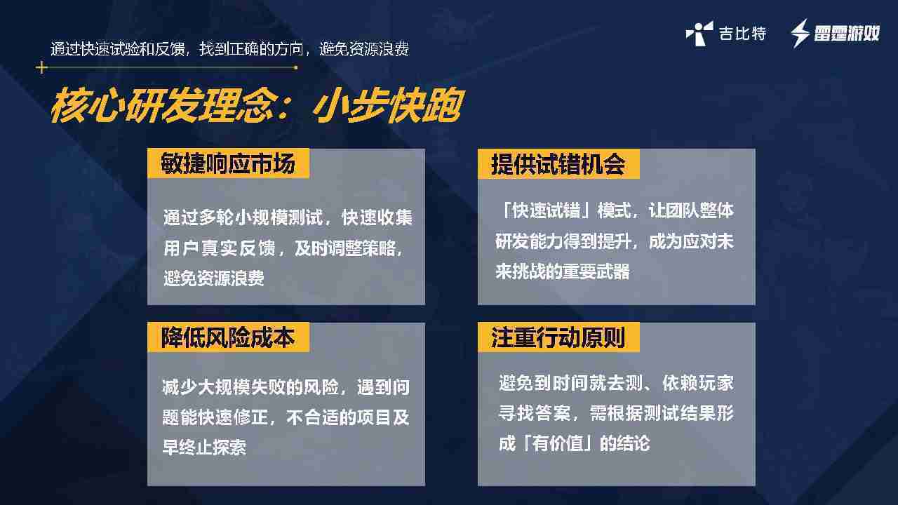 小步快跑不是找答案,,,而是验证答案。。。。我们之前有项目是这样的,,,,有些制作人会有几个方向觉得都可以做,,但是不确定做哪一个,,,会选择几个都做,,,,做完拿到市场跑,,,,跑出哪一个更好,,,基于这个再做后续的研发和拓展。。。。但这种情况最容易出现一个问题,,,,可能被玩家裹胁,,玩家说这个点不错、、、那个点不错,,,到底听还是不听,,,,不听感觉是无视玩家的反馈,,,,听的话,,,,可能自己没想清楚导致研发思路发生偏颇。。。。所以针对这一点后面自己复盘整理,,,发现制作人自己心里要有数,,,,要做自己觉得好玩的,,,而且明确知道这个东西是你想做的,,,,然后拿到市场验证这个答案是不是对的,,,,而不是拿一堆答案找哪一个答案更好。。。。