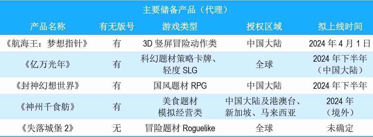 公司储备的多个自研、、、、代理产品都在有序推进当中,,涵盖放置类、、策略类、、、、模拟经营类、、、、RPG、、、Roguelike等多元化游戏品类,,储备的主要自研和代理产品如下:::